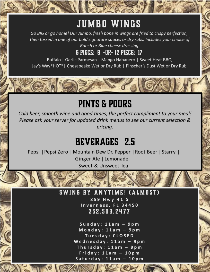 Welcome to Pinscher's Pizzeria, a delightful gem situated at 859 US Hwy 41 S, Inverness, FL. This pizzeria is redefining pizza with its commitment to quality ingredients and exceptional flavors. Customers rave about the vast menu, featuring the massive Big 6 pizza with a crispy yet fluffy crust, making each bite a memorable experience. The wings, particularly the Firecrackers and Chesapeake style, are cooked to perfection, earning high praise for their bold flavors.